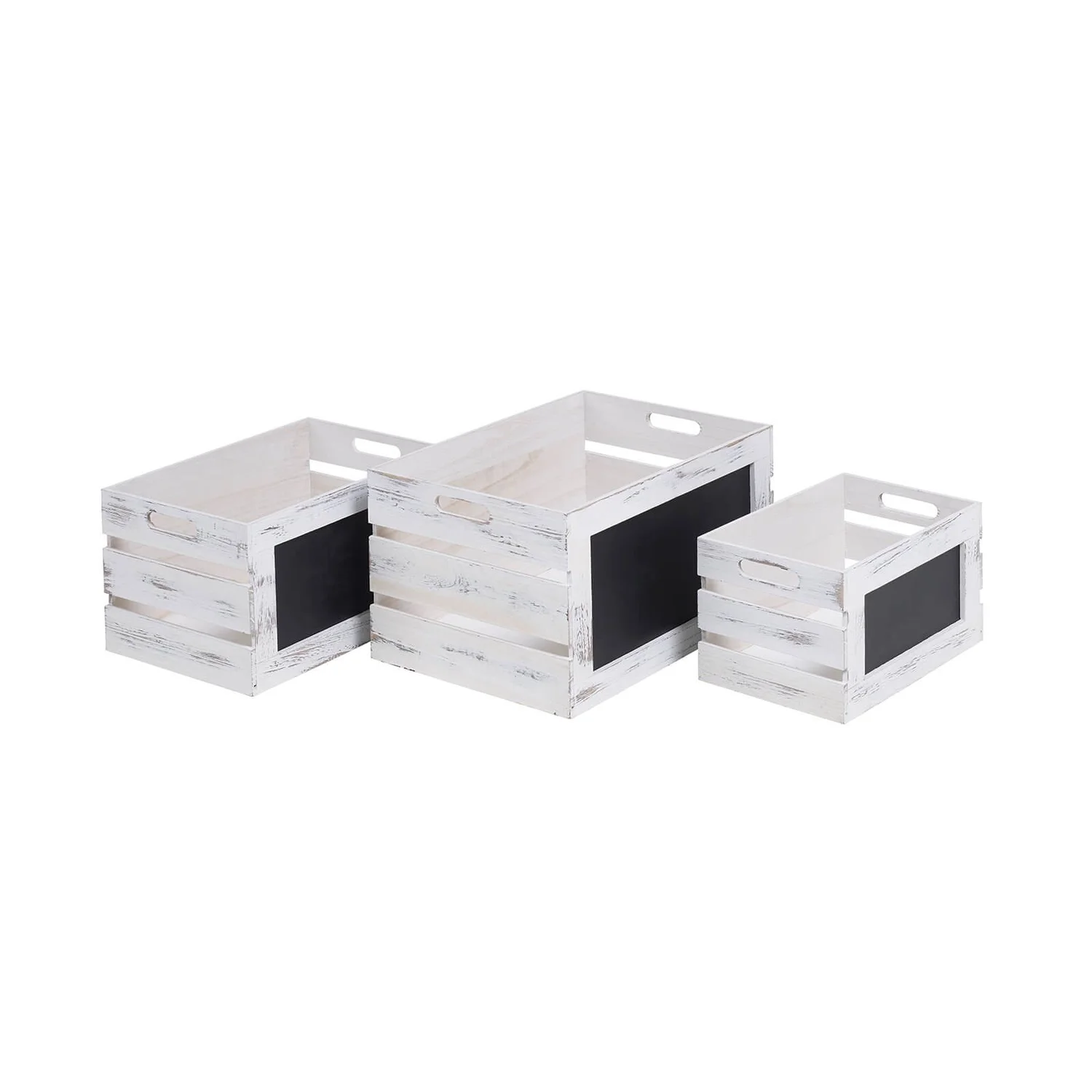 Whitewashed wooden crates add a vintage look to any home. The chalkboard provides modern convenience for storage labelling or for kids to stake their names to piles of toys.